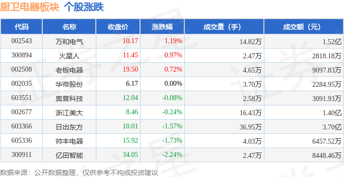 市场整体表现 - 2023年12月25日,厨卫电器板块整体下跌0.15%,表现弱于大盘,当日上证指数上涨0.47%,深证成指上涨0.33% [1] - 板块内个股表现分化,万和电气领涨,涨幅为1.19%,亿田智能领跌,跌幅为2.24% [1] 个股价格与交易情况 - 万和电气收盘价为10.17元,成交量为14.82万手,成交额为1.52亿元 [1] - 火星人收盘价为11.45元,涨幅0.97%,成交量为2.47万手,成交额为2818.18万元 [1] - 老板电器收盘价为19.50元,涨幅0.72%,成交量为4.65万手,成交额为9097.83万元 [1] - 华帝股份收盘价为6.17元,涨跌幅为0.00%,成交量为3.70万手,成交额为2284.95万元 [1] - 奥普科技收盘价为12.04元,下跌0.08%,成交量为2.58万手,成交额为3091.93万元 [1] - 浙江美大收盘价为8.46元,下跌0.24%,成交量为16.43万手,成交额为1.40亿元 [1] - 日出东方收盘价为10.01元,下跌1.57%,成交量为36.95万手,成交额为3.70亿元 [1] - 帅丰电器收盘价为15.92元,下跌1.73%,成交量为4.03万手,成交额为6457.52万元 [1] - 亿田智能收盘价为34.05元,下跌2.24%,成交量为2.47万手,成交额为8448.46万元 [1] 板块资金流向 - 当日厨卫电器板块整体呈现主力资金和游资净流出,散户资金净流入 [1] - 板块主力资金净流出4690.42万元,游资资金净流出1180.97万元,散户资金净流入5871.39万元 [1] 个股资金流向明细 - 万和电气主力资金净流出606.40万元,主力净占比为-3.99%,游资净流入317.99万元,散户净流出924.40万元 [2] - 老板电器主力资金净流入304.81万元,主力净占比3.35%,游资净流入2.24万元,散户净流出307.05万元 [2] - 浙江美大主力资金净流入216.88万元,主力净占比1.55%,游资净流出1497.57万元,散户净流入1280.70万元 [2] - 亿田智能主力资金净流入67.21万元,主力净占比0.80%,游资净流出305.68万元,散户净流入238.47万元 [2] - 华帝股份主力资金净流出85.95万元,主力净占比-3.76%,游资净流入16.45万元,散户净流入69.51万元 [2] - 火星人主力资金净流出188.38万元,主力净占比-6.68%,游资净流入122.83万元,散户净流入65.55万元 [2] - 奥普科技主力资金净流出191.61万元,主力净占比-6.20%,游资净流入62.28万元,散户净流入129.33万元 [2] - 帅丰电器主力资金净流出390.46万元,主力净占比-6.05%,游资净流出105.28万元,散户净流入495.74万元 [2] - 日出东方主力资金净流出5029.32万元,主力净占比-13.58%,游资净流入205.77万元,散户净流入4823.55万元 [2]