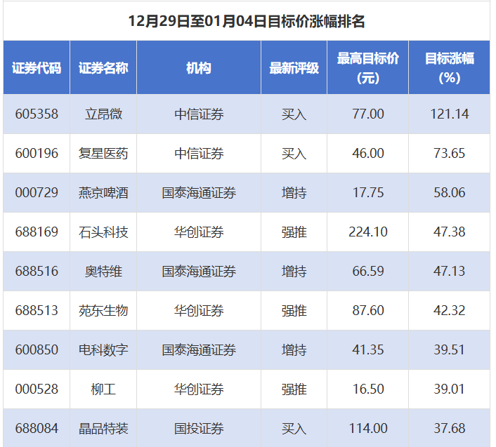 南财投研通数据显示,12月29日至1月4日,券商给予上市公司目标价共46次,按最新收盘价计算,目标价涨幅排 名居前的公司有立昂微、复星医药、燕京啤酒,目标价涨幅分别为121.14%、73.65%、58.06%,分别属于半导 体、化学制药、非白酒行业。 600208 | บบบว่าง | 内刷人 | THEMSERS | TEGAN 1 J JIL | 1.10 | 20.00 | | --- | --- | --- | --- | --- | --- | | 300450 | 先导智能 | 国投证券 | 买人 | 63.81 | 27.67 | | | 日期:12月29日至01月04日,南财投研通×南财快讯制图 | | | | | | | | | 12月29日至01月04日目标价涨幅排名 | | | | --- | --- | --- | --- | --- | --- | | 证券代码 | 证券名称 | 机构 | 最新评级 | 最高目标价 | 目标涨幅 | | | | | | (元) | (%) | | 605358 | 立昂微 | 中信证券 | ぶ | 77.00 | 121.14 | | 600196 ...