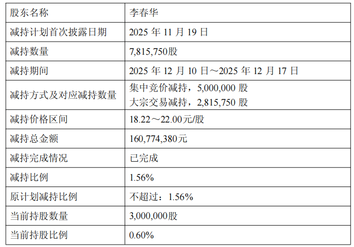 公司于2025年11月19日披露的《关于股东减持股份计划公告》(公告编号:2025-042)。李春华拟通过 集中竞价交易方式减持的股份总数不超过5,000,000股,即不超过公司股份总数的1%,以大宗交易方式 减持的股份总数不超过2,815,750股,即不超过公司股份总数的0.56%。 公司于2025年12月17日收到股东李春华《关于减持股份触及1%刻度暨减持计划实施完毕的告知函》, 其于2025年12月10日至12月17日期间,通过集中竞价交易方式减持公司股份5,000,000股、通过大宗交易 方式减持公司股份2,815,750股,合计占公司总股本的1.56%。减持价格区间为18.22至22.00元/股,减持 总金额160,774,380元。 本次权益变动后,李春华及其一致行动人合计持有的公司股份比例由84.79%减少至83.23%。权益变动 触及1%刻度;并且本次减持计划实施完毕。 中国经济网北京12月19日讯 立达信(605365)(605365.SH)昨日晚间发布关于股东权益变动触及1%刻度 暨减持计划实施完毕的公告称,本次减持计划实施前,公司股东李春华持有公司股份10,815,750股,占 公司总股 ...