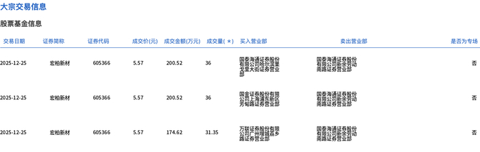 | 交易日期 | 证券简称 | 证券代码 | | | 成交价(元) 成交金额(万元) 成交量(*) 买入营业部 | | 类出管业部 | 是否为专场 | | --- | --- | --- | --- | --- | --- | --- | --- | --- | | 2025-12-25 | 宏柏新材 | e023ee | 5.57 | 200.52 | 36 | | | 香 | | 2025-12-25 | 宏柏新材 | 605366 | 5.57 | 200.52 | 36 | 公司正演 | | KI | | 2025-12-25 | 宏柏丽材 | 605366 | 5.57 | 174.62 | 31.35 | | | KO | 12月25日,宏柏新材大宗交易成交103.35万股,成交额575.66万元,占当日总成交额的5.17%,成交价 5.57元,较市场收盘价6.37元折价12.56%。 ...