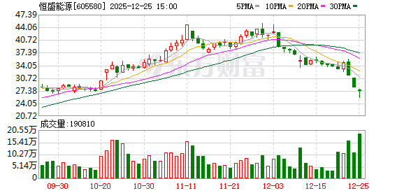 南财智讯12月25日电,恒盛能源公告,公司股票价格于2025年12月23日、12月24日、12月25日连续三个 交易日内日收盘价格跌幅偏离值累计超过20%。根据《上海证券交易所股票上市规则》有关规定,属于 股票交易异常波动的情形。经公司自查并向控股股东、实际控制人核实,截至本公告披露日,不存在涉 及本公司的应披露而未披露导致股价异常波动的事项,包括但不限于重大资产重组、重大交易、业务重 组、股份回购等重大事项。公司目前生产经营状况正常,热电联产业务、CVD金刚石业务、固废资源 综合利用业务均稳定有序开展。公司未发现对公司股票交易价格可能产生重大影响的媒体报道或市场传 闻,亦未涉及市场热点概念。公司及控股股东、实际控制人未发现可能导致股票交易异常波动的其他股 价敏感信息,相关方在本次股价波动期间无买卖公司股票的行为。 ...