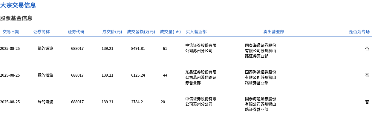 交易数据 - 2025年8月25日绿的谐波(688017)成交价139.21元 成交金额8491.81万元对应成交量61万股 买入方为中信证券苏州分公司 卖出方为国泰海通证券苏州狮山路营业部[1] - 同日发生第二笔交易成交价139.21元 成交金额6125.24万元对应成交量44万股 买入方为东吴证券苏州溪翔路营业部 卖出方为国泰海通证券苏州狮山路营业部[1] - 同日发生第三笔交易成交价139.21元 成交金额2784.2万元对应成交量20万股 买入方为中信证券苏州分公司 卖出方为国泰海通证券苏州狮山路营业部[1] 资金流向 - 当日累计成交金额达1.74亿元 其中国泰海通证券苏州狮山路营业部合计卖出1.74亿元[1] - 中信证券苏州分公司合计买入1.13亿元 东吴证券苏州溪翔路营业部买入6125.24万元[1] - 所有交易均以相同价格139.21元完成 显示交易集中度较高[1] 交易特征 - 卖出营业部高度集中 三笔交易卖方均为国泰海通证券苏州狮山路营业部[1] - 买入营业部出现分化 主要来自中信证券苏州分公司和东吴证券苏州溪翔路营业部[1] - 单日成交量合计125万股 占当日总成交比重较大[1]