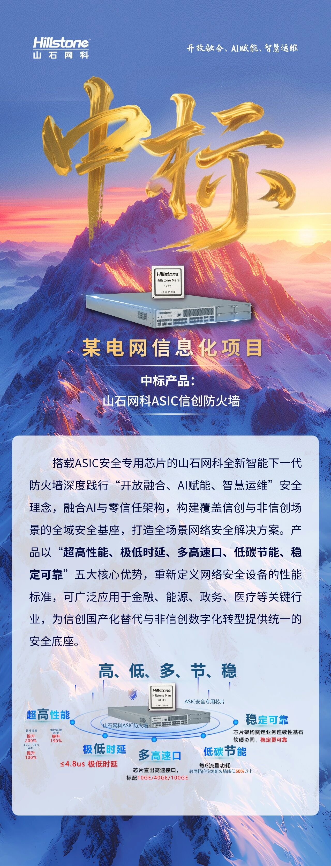 中标产品:山石网科ASIC信创防火墙 搭载ASIC安全专用芯片的山石网科全新智能下- 防火墙深度践行"开放融合、AI赋能、智慧运维"5 理念,融合AI与零信任架构,构建覆盖信创与非信f 景的全域安全基座,打造全场景网络安全解决方案。 品以"超高性能、极低时延、多高速口、低碳节能、 定可靠"五大核心优势,重新定义网络安全设备的\ 标准,可广泛应用于金融、能源、政务、医疗等关键 业,为信创国产化替代与非信创数字化转型提供统 安全展座。 中标产品: 百网科ASIC信创防火墙 搭载ASIC安全专用芯片的山石网科全新智能下 防火墙深度践行"开放融合、AI赋能、智慧运维"3 理念,融合AI与零信任架构,构建覆盖信创与非信f 景的全域安全基座,打造全场景网络安全解决方案。 品以"超高性能、极低时延、多高速口、低碳节能、 定可靠"五大核心优势,重新定义网络安全设备的\ 标准,可广泛应用于金融、能源、政务、医疗等关键 业,为信创国产化替代与非信创数字化转型提供统- 安全底座。 T. CAS NY KUHT X 母い流重り托 芯片直出高速接口, 较同档位传统防火墙降低50%以上 标配10GE/40GE/100GE 中标产品:山石 ...