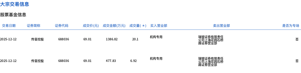 12月12日,传音控股大宗交易成交27.02万股,成交额1864.65万元,占当日总成交额的1%,成交价69.01元,较市场收盘价69.01元持平。 | 交易日期 | 证券简称 | 证券代码 | 成交价(元) | 成交金额(万元) | 成交量(*) 买入营业部 | | | 卖出营业部 | | --- | --- | --- | --- | --- | --- | --- | --- | --- | | 2025-12-12 | 传音控股 | 688036 | 69.01 | 1386.82 | 20.1 | 机构专用 | 公司上海花園品牌 公司上海花園早餐 瑞菲酒店 | | | 2025-12-12 | 传音控股 | 688036 | 69.01 | 477.83 | 6.92 | 机构专用 | 公司上海找國星线 瑞耀证券員提出 路道近東員 | | ...