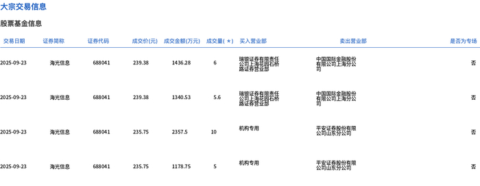 大宗交易概况 - 2025年9月23日海光信息发生大宗交易成交26.6万股,总成交金额6313.06万元,占当日总成交额比例0.46% [1] - 成交均价237.33元,较市场收盘价254.66元折价6.8%,最高成交价239.38元,最低成交价235.75元 [1] 交易明细分析 - 四笔大宗交易成交价格分两个层级:两笔为239.38元,两笔为235.75元 [2] - 单笔最大成交金额为2357.5万元(成交量10万股),最小成交金额为1178.75万元(成交量5万股) [2] - 买入营业部出现"机构专用"记录,卖出营业部包含非机构账户 [2]