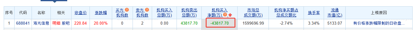 龙虎榜交易数据 - 海光信息收盘价220.84元 单日涨幅20.00% [1] - 机构席位净卖出43817.70万元 占市场总成交额1599696.99万元的2.74% [1] - 卖出前五名中出现两家机构专用席位 合计卖出43817.70万元 [1] 买卖席位结构 - 沪股通专用席位同时位列买一和卖一 买入130548.26万元(占比8.16%)同时卖出131582.37万元 [2] - 买入前五席位合计买入236034.67万元 占总成交额14.75% [2] - 卖出前五席位合计卖出220523.23万元 其中两家机构席位分别卖出25385.47万元和18432.24万元 [2] 资金流向特征 - 中信证券上海分公司呈现双向交易 买入27736.81万元同时卖出20731.98万元 [2] - 机构席位净卖出43817.70万元 而沪股通席位净卖出1034.11万元 [1][2] - 前五买卖席位总成交差额为15511.44万元 呈现净买入状态 [2]