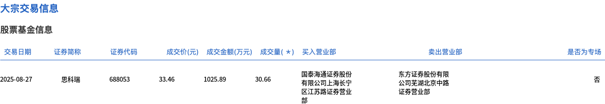 大宗交易概况 - 思科瑞于8月27日发生大宗交易 成交量为30.66万股 成交金额为1025.89万元 占当日总成交额比例达8.1% [1] - 成交价格为33.46元 与当日市场收盘价格完全持平 [1] 交易细节 - 买方营业部为国泰君安证券上海长宁区江苏路证券营业部 卖方营业部为东方证券芜湖北京中路证券营业部 [2] - 证券代码为688053 交易通过大宗交易平台完成 [2]
