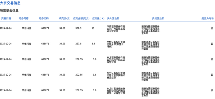 大宗交易概况 - 2025年12月23日,华依科技发生大宗交易,成交量为92.94万股,成交额为3013.05万元,占该股当日总成交额的29.35% [1] - 该笔大宗交易的成交价格为32.42元,与当日市场收盘价32.42元持平 [1] 交易细节 - 交易证券为华依科技,证券代码为688071 [2] - 买入营业部为“藝奇慧發發專輯”,卖出营业部为“習開發發酵素露” [2] - 该笔交易被标记为“专场”交易 [2]