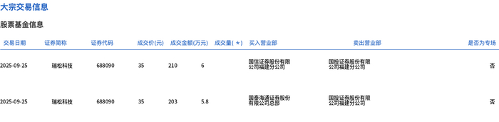 大宗交易概况 - 2025年9月25日瑞松科技发生大宗交易成交11.8万股,成交额413万元,占当日总成交额2% [1] - 成交价格35元,较市场收盘价41.34元折价15.34% [1] 交易明细数据 - 当日出现两笔大宗交易记录,证券代码分别为688080和688090 [2] - 第一笔交易成交价35元,成交金额210万元,买入方为因筒罐露劈公营限,卖出方为思智慧器男女有限 [2] - 第二笔交易成交金额203万元,成交量5.8万股,买入方为国泰海通运营服份有限公司总营,卖出方为圆筒是落劈垫高限 [2]