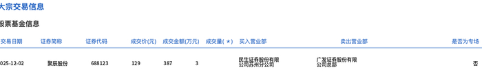 交易概况 - 2023年12月2日,聚辰股份发生一笔大宗交易,成交量为3万股,成交金额为387万元 [1] - 该笔交易成交价为129元,与当日市场收盘价129元持平 [1] - 此次大宗交易成交额占公司当日总成交额的0.73% [1] 交易细节 - 交易证券代码为688123,证券简称为聚辰股份 [2] - 买入营业部为恳告景烈劈贸有限,卖出营业部为公書還塑設份有限 [2] - 成交价为129元,成交金额为387万元,成交量为3万股 [2]
