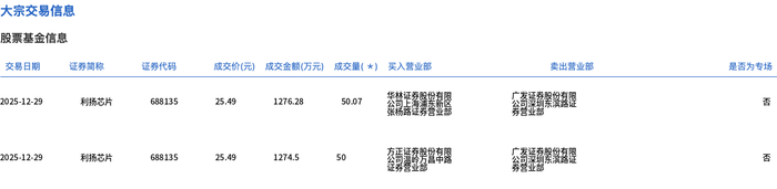 利扬芯片现2笔大宗交易 合计成交100.07万股