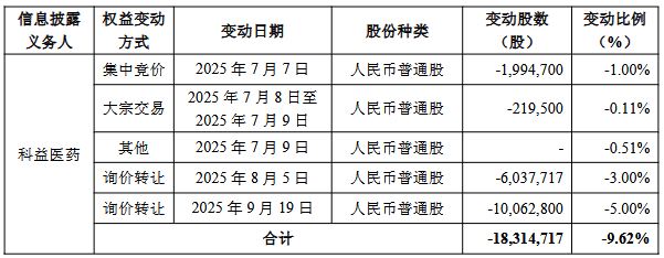 股东减持情况 - 科益医药通过询价转让减持公司股份16,100,517股,占总股本8.00%,其中2025年8月5日减持6,037,717股(3.00%),2025年9月19日减持10,062,800股(5.00%)[1][2] - 通过集中竞价和大宗交易合计减持2,214,200股,其中2025年7月7日集中竞价减持1,994,700股(1.00%),2025年7月8日至9日大宗交易减持219,500股(0.11%)[1][2] - 累计减持总数18,314,717股,占总股本9.62%,套现总金额约8.53亿元(按减持期间均价46.60元/股计算)[1][2] 股权结构变动 - 科益医药及其一致行动人邓学勤合计持股比例由65.00%降至55.38%,累计权益变动达9.62个百分点[1][2][3] - 变动后科益医药持股109,688,630股(54.50%),邓学勤持股1,764,125股(0.88%),合计持有111,452,755股[2][3] - 科益医药为实际控制人邓学勤控制企业,双方构成一致行动关系[3] 公司控制权影响 - 本次权益变动未导致控股股东及实际控制人变更[3] - 转让行为未对公司治理结构及持续经营产生重大影响[3]