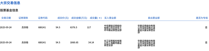 交易概况 - 杰华特于9月24日发生大宗交易,成交量151.14万股,成交金额8237.15万元,占当日总成交额3.92% [1] - 成交价格54.5元,较市场收盘价57.97元折价5.99% [1] 交易明细 - 第一笔交易成交量117万股,成交金额6376.5万元,成交价54.5元 [2] - 第二笔交易成交量34.14万股,成交金额1860.65万元,成交价54.5元 [2]