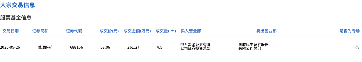 大宗交易概况 - 博瑞医药于2025年9月26日发生一笔大宗交易,成交量为4.5万股,成交金额为261.27万元,占当日总成交额的0.17% [1] - 该笔交易成交价格为58.06元,与当日市场收盘价完全持平,未出现折价或溢价情况 [1] 交易细节 - 该笔交易买方为电万泰源证券,卖方为国联民生证券股份有限公司总部 [2] - 交易标的为博瑞医药A股股票,证券代码688166 [2]