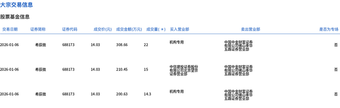 1月6日,希荻微大宗交易成交51.3万股,成交额719.74万元,占当日总成交额的3.77%,成交价14.03 元,较市场收盘价15.69元折价10.58%。 | 交易日期 | 证券简称 | 证券代码 | | | 成交价(元) 成交金额(万元) 成交量(*) 买入营业部 | | 类出营业部 | 是否为专场 | | --- | --- | --- | --- | --- | --- | --- | --- | --- | | 2026-01-06 | 希获微 | 688173 | 14.03 | 308.66 | 22 | 机构专用 | 有限量 | 140 | | 2026-01-06 | 希薇微 | 688173 | 14.03 | 210.45 | 15 | 是有限公司及查看 | 中国空间的重要 | KI | | 2026-01-06 | 希获微 | 688173 | 14.03 | 200.63 | 14.3 | 机构专用 | 調年 | KO | ...