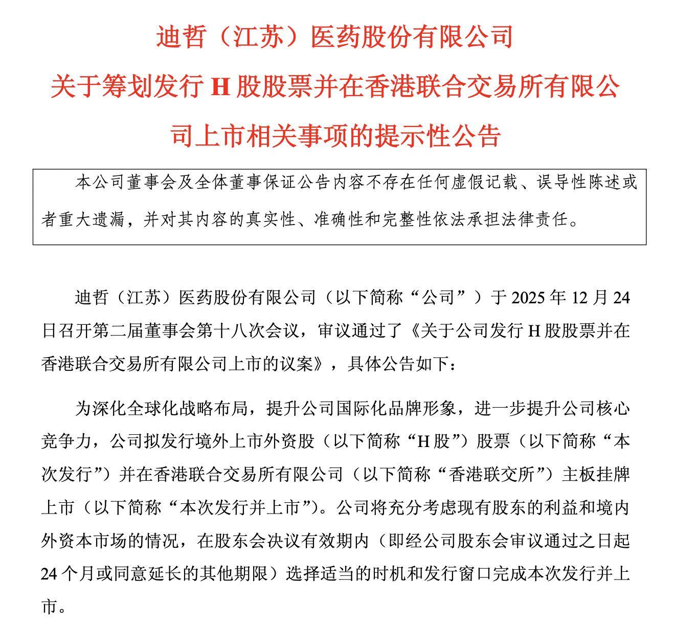 点击查看公告原文>> 来源:新浪港股-好仓工作室 声明:市场有风险,投资需谨慎。 本文为AI大模型基于第三方数据库自动发布,任何在本文出现的信 息(包括但不限于个股、评论、预测、图表、指标、理论、任何形式的表述等)均只作为参考,不构成 个人投资建议。受限于第三方数据库质量等问题,我们无法对数据的真实性及完整性进行分辨或核验, 因此本文内容可能出现不准确、不完整、误导性的内容或信息,具体以公司公告为准。如有疑问,请联 系biz@staff.sina.com.cn。 迪哲(江苏)医药股份有限公司(证券代码:688192)于2025年12月25日发布公告称,公司已于2025年12 月24日召开第二届董事会第十八次会议,审议通过了《关于公司发行H股股票并在香港联合交易所有限 公司上市的议案》。此次筹划发行H股并在香港联交所主板上市,旨在深化全球化战略布局,提升公司 国际化品牌形象及核心竞争力。公司将在股东会决议有效期内(即经股东会审议通过之日起24个月或同 意延长的其他期限)选择适当时机完成发行上市,相关事宜需符合《公司法》《证券法》《境内企业境 外发行证券和上市管理试行办法》及香港联交所上市规则等规定,并取得中国证 ...