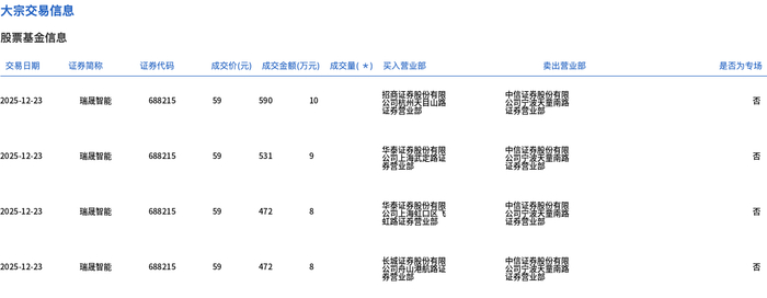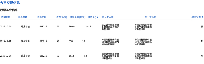| 交易日期 | 证券简称 | 证券代码 | | | 成交价(元) 成交金额(万元) 成交量(*) 买入营业部 | | 卖出营业部 | 是否为专场 | | --- | --- | --- | --- | --- | --- | --- | --- | --- | | 2025-12-24 | 瑞晟智能 | 688215 | 59 | 799.45 | 13.55 | 公司 交易公寓签 | 容前身落 發展增落 | Ka | | 2025-12-24 | 瑞展智能 | 688215 | ਟੋਰੇ | 590 | 10 | 容量是最大的发展 | 零前景名家具销器 | KI | | 2025-12-24 | 瑞展智能 | 688215 | દેતે | 501.5 | ક્ષેત્રે | 公司是有意與英國 | 去日景观察员首届 | Ka | 12月24日,瑞晟智能大宗交易成交32.05万股,成交额1890.95万元,占当日总成交额的23.73%,成交价 59元,较市场收盘价71.69元折价17.7%。 ...
