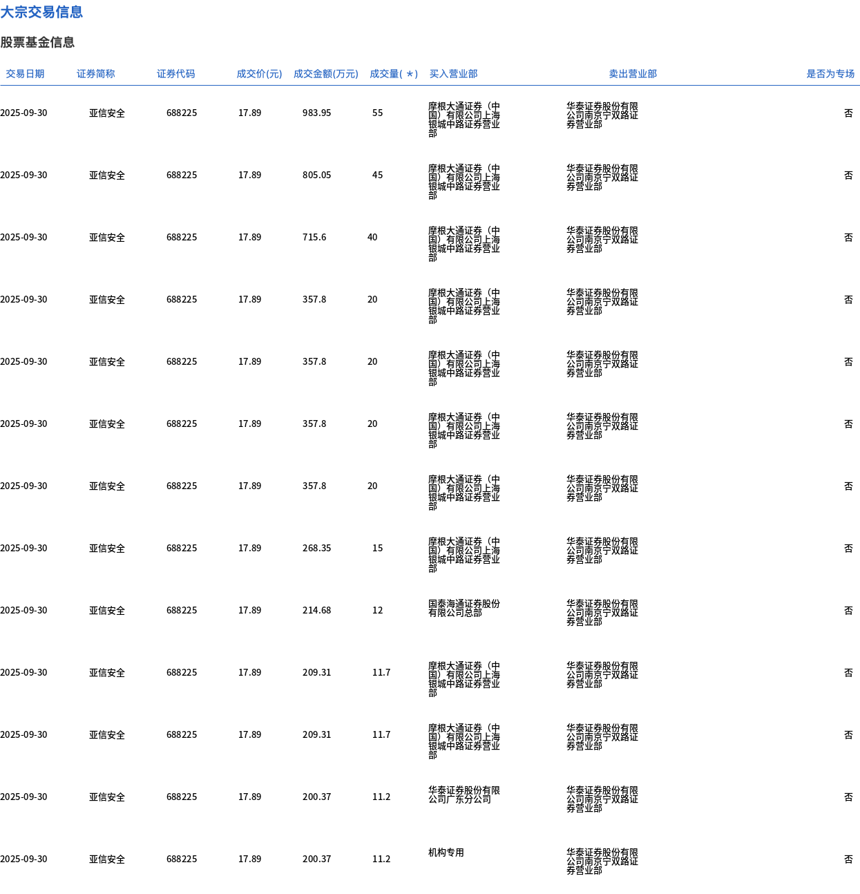 9月30日,亚信安全大宗交易成交292.8万股,成交额5238.19万元,占当日总成交额的16.94%,成交价17.89元,较市场收盘价21.9元折价18.31%。 | 交易日期 | 证券简称 | 证券代码 | 成交价(元) | | 成交金额(万元) 成交量(*) 买入营业部 | | 卖出营业部 | | --- | --- | --- | --- | --- | --- | --- | --- | | 2025-09-30 | 亚信安全 | 688225 | 17.89 | 983.95 | દર | | | | 2025-09-30 | 亚信安全 | 688225 | 17.89 | 805.05 | 45 | 公司上海 | 南京学校露提 | | 2025-09-30 | 亚信安全 | 688225 | 17.89 | 715.6 | 40 | 国) 有限公民音优 | | | 2025-09-30 | 亚信安全 | 688225 | 17.89 | 357.8 | 20 | | | | 2025-09-30 | 亚信安全 | 688225 | 17.89 | 357.8 | 20 | | 南京宁 | | 2 ...