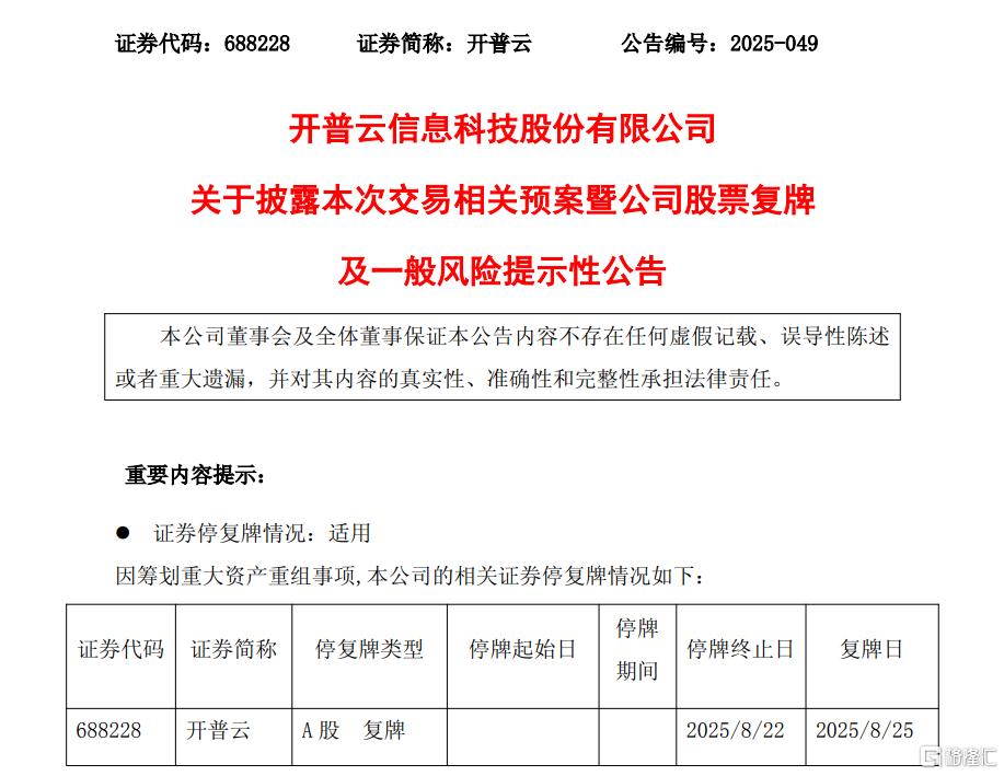 重大资产重组方案 - 公司拟通过支付现金及发行股份相结合的方式分步收购南宁泰克半导体有限公司100%股权[1][5] - 第一步以现金收购深圳金泰克持有的南宁泰克70%股权[6] - 第二步以发行股份方式收购剩余30%股权[6] - 交易完成后公司将新增存储产品相关业务[6] 交易结构安排 - 深圳金泰克需将其全部存储产品业务经营性资产及人员转移至南宁泰克[6] - 计划向不超过35名特定投资者发行股份募集配套资金[6] - 募集资金用于支付现金对价、项目建设、补充流动资金及偿还债务[6] 财务数据表现 - 南宁泰克2024年总营收23.66亿元[9] - 开普云2024年总营收6.18亿元[9] - 南宁泰克营收规模为开普云的3.83倍[9] - 南宁泰克2025年1-6月营业收入13.13亿元[10] - 南宁泰克2025年1-6月净利润0.49亿元[10] 股权变动情况 - 控股股东汪敏等向深圳市晤股峰登半导体合伙企业协议转让1399.65万股[10] - 转让股份占总股本20.73%[10] - 转让价格52.64元/股[10] - 总转让价款7.37亿元[10] - 晤股峰登由深圳金泰克持股90%、李创锋持股10%[10] 市场反应 - 公司股票8月25日复牌后20cm涨停[2] - 报收78.96元/股[2] - 总市值达53.31亿元[2] 业务协同效应 - 公司主要从事技术开发、技术推广等科技服务业务[8] - 已构建全栈AI产品体系覆盖AI算力、大模型、智能体中台和智慧应用[8] - 南宁泰克主要从事存储器的研发、生产和销售[8] - 交易有利于公司深化数字经济产业布局践行"软件+硬件"一体化发展战略[7] 交易影响 - 交易不会导致公司控制权变更[11] - 公司将整合标的公司研发团队、客户渠道、专利技术及供应链体系[10] - 公司总资产、营业收入等将进一步增长[10] - 持续经营能力将增强[10]