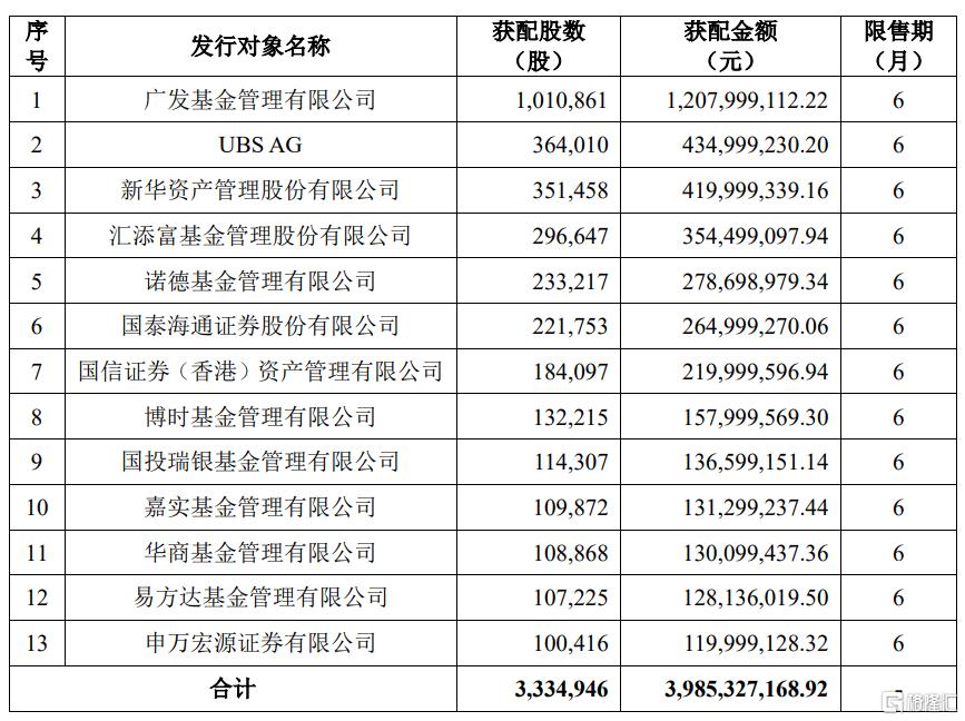 | 序 | 发行对象名称 | 获配股数 | 获配金额 | 限售期 | | --- | --- | --- | --- | --- | | 름 | | (股) | (元) | (月) | | 1 | 广发基金管理有限公司 | 1.010.861 | 1,207.999.112.22 | 6 | | 2 | UBS AG | 364,010 | 434,999,230.20 | 6 | | 3 | 新华资产管理股份有限公司 | 351,458 | 419,999,339.16 | 6 | | 4 | 汇添富基金管理股份有限公司 | 296,647 | 354,499,097.94 | 6 | | 5 | 诺德基金管理有限公司 | 233,217 | 278,698,979.34 | 6 | | 6 | 国泰海通证券股份有限公司 | 221,753 | 264,999,270.06 | 6 | | 7 | 国信证券(香港)资产管理有限公司 | 184,097 | 219,999,596.94 | 6 | | 8 | 博时基金管理有限公司 | 132,215 | 157,999,569.30 | 6 | | 9 | ...