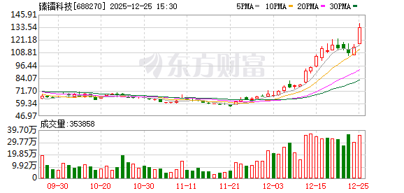 长江商报记者发现,尽管股价大涨,但公司实际控制人郁发新并未减持。 臻镭科技是一家集成电路芯片供应商,产品已应用于多个国家重大装备型号,其中终端射频前端芯片已 应用于无线通信终端、北斗导航终端和新一代电台。 12月25日,臻镭科技股价小幅高开,全天高走,盘中一度涨停,最终收涨16.90%,收盘价为133.50元/ 股,市值为285.8亿元。 K线图显示,2025年初以来,臻镭科技股价从35元/股开始上涨,年内累计上涨2.81倍,创了近三年新 高。 长江商报消息 ●长江商报记者 沈右荣 股价再度大涨,臻镭科技(688270.SH)市值逼近290亿元。 根据市场形势,臻镭科技对一募投项目延期。12月24日晚,臻镭科技公告称,根据市场行情和下游需求 情况,公司将射频微系统研发及产业化项目延期一年。 业绩复苏股价大涨 臻镭科技股价创了近三年新高。 12月25日,二级市场上,臻镭科技表现积极。小幅高开,迅速拉升,盘中一度涨停,临近早盘收盘,涨 停被打开,但直至午后收盘,股价均在高位运行。 K线图显示,2025年以来,臻镭科技的股价从年初的35元/股,涨至12月25日的最高137.04元/股,区间 最大涨幅为291.54% ...