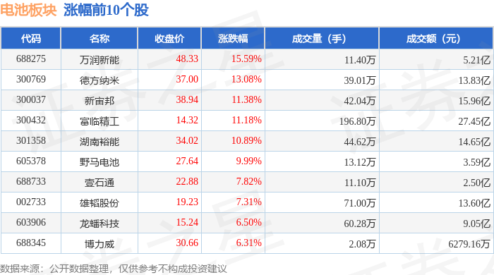 电池板块整体表现 - 2023年8月11日电池板块整体上涨1.94%,领涨个股为万润新能(涨幅15.59%)[1] - 当日上证指数上涨0.34%至3647.55点,深证成指上涨1.46%至11291.43点[1] - 板块主力资金净流入22.95亿元,游资净流出20.18亿元,散户净流出2.76亿元[2] 个股价格表现 - 万润新能收盘48.33元,成交量11.40万手,成交额5.21亿元[1] - 德方纳米涨幅13.08%至37.00元,成交量39.01万手[1] - 新宙邦上涨11.38%至38.94元,成交量42.04万手[1] - 富临精工上涨11.18%至14.32元,成交量196.80万手[1] - 湖南裕能涨幅10.89%至34.02元,成交量44.62万手[1] 资金流向特征 - 雄韬股份主力净流入2.80亿元(占比20.55%),游资净流出1.51亿元[3] - 富临精工主力净流入2.18亿元(占比7.95%),游资净流出1.42亿元[3] - 亿纬锂能主力净流入1.67亿元(占比5.18%),游资净流出9458.62万元[3] - 野马电池主力净流入1.28亿元(占比35.53%),游资净流出6732.49万元[3] - 宁德时代成交额56.28亿元,涨幅0.07%[2]