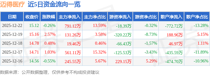 股票行情快报:迈得医疗(688310)12月22日主力资金净买入791.12万元