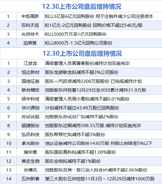 上市公司股份回购与股东减持情况汇总 - 2023年12月30日盘后,共有4家A股上市公司披露股份回购计划,14家公司披露股东或高管减持情况 [1] 上市公司股份回购计划详情 - **中炬高新**:计划以3亿元至6亿元回购股份,回购股份将用于注销并减少注册资本 [3] - **百利天恒**:计划以1亿元至2亿元回购股份,回购价格上限为546元/股 [3] - **光启技术**:计划以5000万元至1亿元回购股份 [3] - **珀莱雅**:计划以8000万元至1.5亿元回购公司股份 [3] 上市公司股东及高管减持情况详情 - **江波龙**:高级管理人员高喜春股份减持计划已实施完毕 [3] - **恒达新材**:股东龙游联龙计划减持不超过公司总股本的3% [3] - **国信证券**:股东一汽投资已完成减持计划,累计减持2200万股 [3] - **联合精密**:控股股东何桂景于12月29日至30日累计减持31.9万股 [3] - **颀中科技**:高级管理人员周小青计划减持不超过公司总股本的0.01% [3] - **华兴源创**:计划减持不超过43.49万股已回购股份 [3] - **苏试试验**:控股股东苏试总厂计划减持不超过公司总股本的2% [3] - **超捷股份**:控股股东近期减持398.55万股,减持计划已实施完毕 [3] - **弘讯科技**:股东帮帮忙计划减持不超过公司总股本的3% [3] - **紫光股份**:股东信达证券减持1430万股,持股比例降至5%以下 [3] - **瑞华泰**:股东国投高科计划减持不超过公司总股本的1.00% [3] - **美农生物**:股东全裕计划减持不超过公司总股本的1% [3] - **优博讯**:控股股东及其一致行动人计划合计减持不超过公司总股本的2.96% [3] - **五洲新春**:第三大股东五洲控股于11月3日至12月29日期间累计减持1000万股 [3]