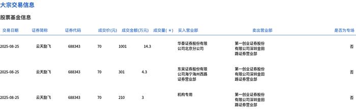云天励飞8月25日现3笔大宗交易 总成交金额1512万元 其中机构买入210万元 溢价率为-20.00%