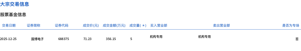 大宗交易概况 - 12月25日,国博电子发生大宗交易,成交5万股,成交总额为356.15万元 [1] - 该笔大宗交易成交额占公司当日总成交额的0.49% [1] - 成交价格为71.23元,相较于当日市场收盘价80.49元,折价幅度为11.5% [1]