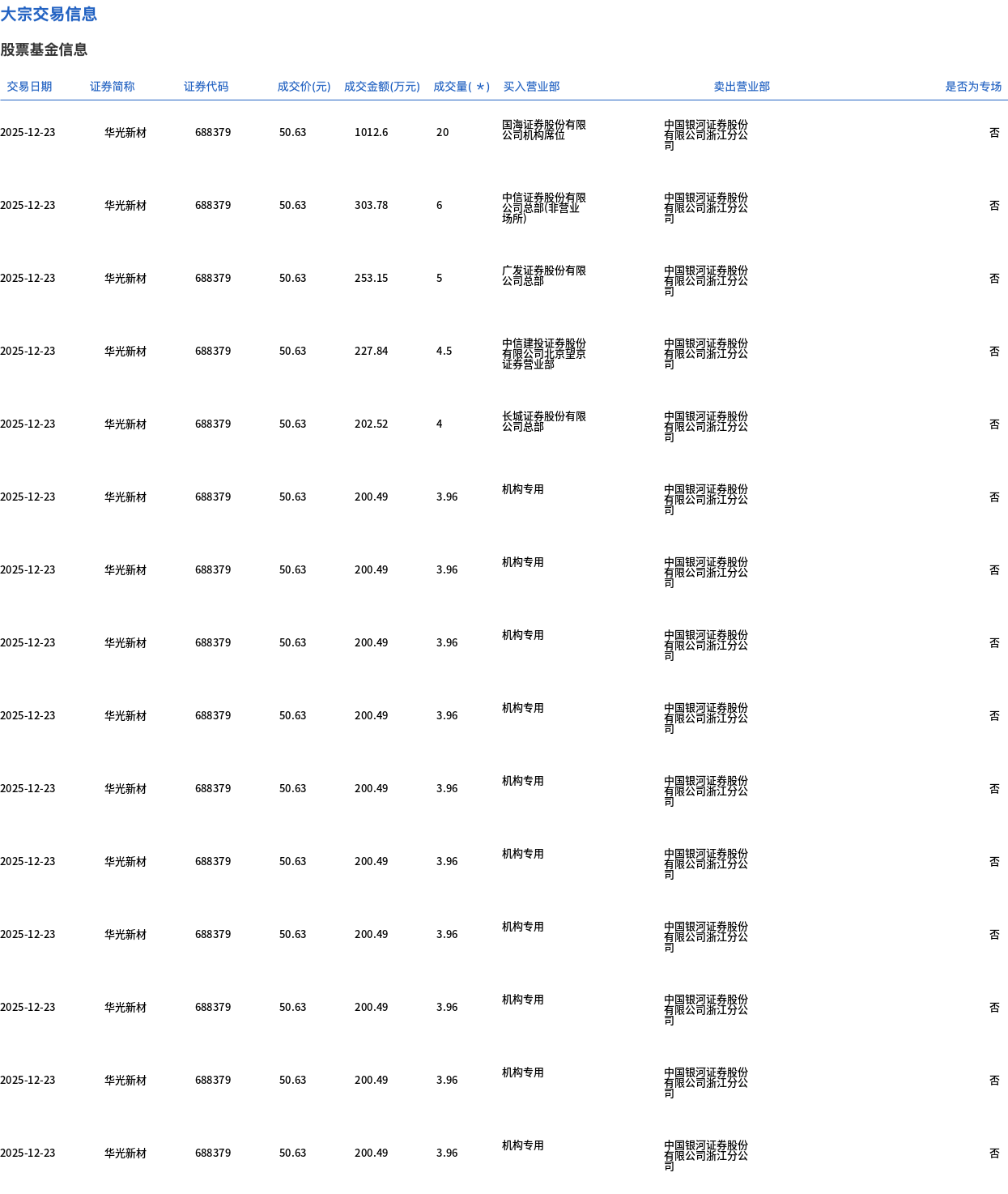 12月23日,华光新材大宗交易成交79.1万股,成交额4004.79万元,占当日总成交额的6.6%,成交价50.63元,较市场收盘价61元折价17%。 | 交易日期 | 证券简称 | 证券代码 | 成交价(元) | | 成交金额(万元) 成交量(*) 买入营业部 | | 卖出营业部 | | --- | --- | --- | --- | --- | --- | --- | --- | | 2025-12-23 | 华光新材 | 688379 | 50.63 | 1012.6 | 20 | 公司机构席位 | 看閱公司 # 空公交 | | 2025-12-23 | 华光新材 | 688379 | 50.63 | 303.78 | 6 | 评题 中国资费(翡翠亚 | 有限公司浙范势公 | | 2025-12-23 | 华光新材 | 688379 | 50.63 | 253.15 | 5 | ) 友驻劳股份有限 | 中国银河站竞 | | 2025-12-23 | 华光新材 | 688379 | 50.63 | 227.84 | 4.5 | 建设置北景 更临公司北景重岗 | 有限公司涨至势公 中国 | | 2025-1 ...