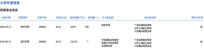 大宗交易概况 - 益方生物于2025年9月11日发生大宗交易成交207万股,成交总额6241.05万元,占当日总成交额6.82% [1] - 成交价格30.15元,较市场收盘价35.22元折价14.4% [1] 交易明细分析 - 主要交易分两笔完成:第一笔成交200万股,成交金额6030万元;第二笔成交7万股,成交金额211.05万元 [2] - 买入方涉及机构专用席位和中信建投证券股份有限公司北京里京营业部 [2] - 卖出方均为广发证券股份有限公司上海虹口区四川北路证券营业部 [2]
