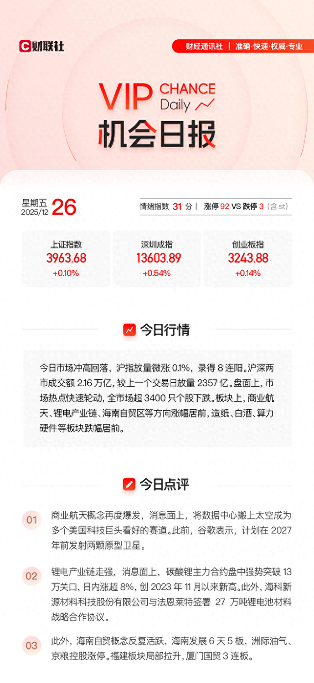 市场热点一 商业航天 - 核心观点:将数据中心搬上太空成为多个美国科技巨头看好的赛道,谷歌计划在2027年前发射两颗原型卫星[4] - 市场表现:商业航天板块带动市场情绪,相关个股表现活跃[5] - 神剑股份:在商业航天情绪带动下,于12月25日、26日连续收获2个涨停板[5] - 通宇通讯:公司是通信天线行业龙头,与华为合作紧密,5G产品批量出货并布局5.5G/6G,通过参股鸿擎科技、投资凌空天行及参股四川光为,前瞻性布局卫星互联网、空天飞行器及高速光模块,实现向空天信息等前沿战略领域拓展,于12月25日、26日收获2连板[8] - 信科移动:公司聚焦“空天地一体化”战略,首倡“5G体制兼容、6G系统融合”卫星互联网路径,具备星载基站、相控阵天线等全系列产品,深度参与低轨卫星互联网在轨验证及组网建设,6G技术领先,完成2025年全部五项技术测试并获证书,12月26日股价日内最高上涨12.36%,收盘上涨9.36%[10] 市场热点二 锂电 - 核心观点:碳酸锂主力合约盘中强势突破13万元/吨关口,日内涨幅超过8%,创2023年11月以来新高[12] - 行业动态:海科新源与法恩莱特签署27万吨锂电池材料战略合作协议[12] - 华盛锂电:公司是国内电解液添加剂龙头,现有VC及FEC产品产能达到14000吨/年,受益于添加剂价格底部反弹及供需紧平衡,12月26日起4个交易日内股价最高上涨23.57%[13][14] - 天际股份:机构认为锂电行业正处于供给拐点与需求新周期的交汇点,第二轮趋势性行情或已在酝酿中,公司股价在12月24日、26日收获涨停[16][17] - 华联控股:公司以1.75亿美元收购Argentum公司100%股份,获取阿根廷Arizaro盐湖区锂矿项目80%权益,标志新能源业务转型进入实质阶段,碳酸锂价格自2025年7月末至12月19日上涨32%,且2027年或出现供需短缺,12月26日公司股价收获涨停[19] - 多氟多:公司锂电池产能8.5GWh/年,动力电池订单激增,2026年产能释放后出货量预计达30GWh,储能占比将达50%-60%,六氟磷酸锂全年出货量约5万吨,12月26日起4个交易日内股价最高上涨13.69%[21][22] - 海科新源:公司与法恩莱特签署2026-2028年27万吨电解液溶剂及添加剂供货协议,公司主营碳酸酯系列电解液溶剂及添加剂,聚焦“锂电池材料+消费化学品”双轮战略,12月26日股价收获20%涨停[25] 市场热点三 海南自贸区 - 核心观点:海南自由贸易港正式启动全岛封关首周,政策叠加效应带动离岛免税消费市场迎来热潮[26] - 政策数据:12月18日至24日,海口海关共监管“一线”进口“零关税”享惠货物超4亿元,监管“二线”内销加工增值免关税货物超2000万元[26] - 海汽集团:机构认为政策红利释放催生消费活力,制度层面降本增效将持续改善经营主体成本结构,公司股价于12月26日收获涨停[27] - 海南发展:机构观点指出海南封关不仅是区域性政策突破,更将作为核心驱动力在未来持续释放消费潜力,为相关的酒店、免税及旅游产业链公司带来明确增长机遇,公司股价于12月26日收获涨停[29]