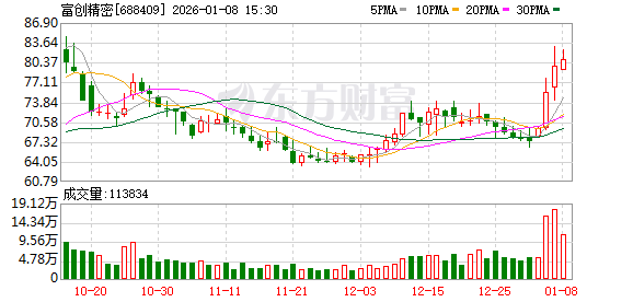 1月7日,富创精密涨5.34%,截至发稿,报79.56元/股,成交6.17亿元,换手率2.64%,总市值243.62亿 元。 资料显示,沈阳富创精密设备股份有限公司位于辽宁省沈阳市浑南区飞云路18甲-1号,成立日期2008年 6月24日,上市日期2022年10月10日,公司主营业务涉及7纳米工艺制程半导体设备的精密零部件制造 商。主营业务收入构成为:机械及机电零组件68.56%,气体传输系统28.92%,其他(补充)2.51%。 财通福瑞混合发起(LOF)A(501028)成立日期2016年11月22日,最新规模5807.18万。今年以来收益 1.25%,同类排名6804/8823;近一年收益14.19%,同类排名5910/8083;成立以来收益45.7%。 财通福瑞混合发起(LOF)A(501028)基金经理为顾弘原。 截至发稿,顾弘原累计任职时间4年228天,现任基金资产总规模4.94亿元,任职期间最佳基金回报 55.21%, 任职期间最差基金回报-23.03%。 风险提示:市场有风险,投资需谨慎。本文为AI大模型自动发布,任何在本文出现的信息(包括但不 限于个股、评论、预测、图表、指标、理论、任何形式的 ...