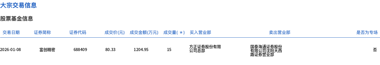 | 交易日期 | 证券简称 | 证券代码 | 成交价(元) 成交金额(万元) 成交量( * ) 买入营业部 | | | | | 卖出营业部 | | --- | --- | --- | --- | --- | --- | --- | --- | --- | | 2026-01-08 | 富创精密 | 688409 | 80.33 | 1204.95 | | 友正证券股份有限 公司总部 | 国泰海通证券股份 有限公司沈阳犬省 | | 1月8日,富创精密大宗交易成交15万股,成交额1204.95万元,占当日总成交额的1.29%,成交价80.33元,较市场收盘价80.9元折价0.7%。 ...