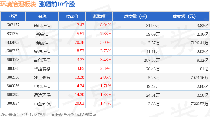 板块整体表现 - 环境治理板块较上一交易日下跌0.47% [1] - 上证指数报收3860.5点下跌0.26% 深证成指报收13005.77点上涨0.63% [1] 领涨个股表现 - 德创环保(603177)涨幅8.94%居首 收盘价12.43元 成交量31.90万手 成交额3.82亿元 [1] - 新安洁(831370)涨幅7.83% 收盘价5.51元 成交量39.69万手 成交额2.16亿元 [1] - 保配洁(832802)涨幅5.00% 收盘价20.38元 成交量3.57万手 成交额7126.41万元 [1] - 复洁环保(688335)涨幅3.75% 收盘价18.52元 成交量11.11万手 成交额2.02亿元 [1] - 首创环保(600008)涨幅3.48% 收盘价3.27元 成交量287.55万手 成交额9.32亿元 [1] 领跌个股表现 - 我的不错(688466)跌幅5.32% 收盘价22.25元 成交量1.71万手 成交额3865.46万元 [2] - 节能国被(300388)跌幅4.30% 收盘价8.91元 成交量29.29万手 成交额2.63亿元 [2] - 惠城环保(300779)跌幅4.24% 收盘价178.06元 成交量4.22万手 成交额7.59亿元 [2] - 上海洗蛋(603200)跌幅3.37% 收盘价100.00元 成交量18.03万手 成交额18.39亿元 [2] 资金流向情况 - 板块主力资金净流出5.42亿元 [2] - 游资资金净流入1.61亿元 [2] - 散户资金净流入3.81亿元 [2] - 德创环保主力净流入2826.12万元 占比7.41% [3] - 中创环保主力净流入2339.00万元 占比8.36% [3] - 洪城环境主力净流入1775.89万元 占比10.64% [3] - 高能环境主力净流入1768.10万元 占比10.93% [3]