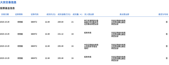 大宗交易概况 - 2025年10月29日,阿特斯发生大宗交易,成交200万股,成交额2568万元,占当日总成交额的1.12% [1] - 大宗交易成交价为12.84元,较市场收盘价14.84元折价13.48% [1] 交易细节分析 - 部分交易由机构专用席位买入,例如一笔成交18万股,金额231.12万元,另一笔成交16万股,金额205.44万元 [2] - 交易记录显示存在多个不同成交量的分笔交易,成交量从16万股至22万股不等 [2][3] - 交易买卖双方营业部信息在记录中有所体现,但部分名称存在乱码或识别不清的情况 [2][3]