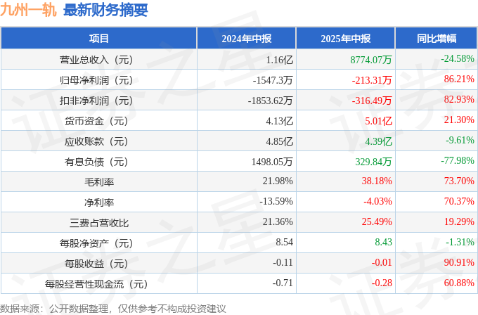 九州一轨2025年中报简析:亏损收窄,盈利能力上升