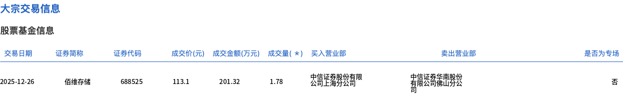 大宗交易概况 - 2025年12月26日,佰维存储发生一笔大宗交易,成交量为1.78万股,成交金额为201.32万元,占该股当日总成交额的0.09% [1] - 该笔大宗交易的成交价格为113.1元,与当日市场收盘价113.1元持平 [1] 交易细节 - 交易日期为2025年12月26日,证券简称为佰维存储,证券代码为688525 [2] - 买入营业部为中信证券股份有限公司上海分公司 [2] - 卖出营业部为中信证券华南股份有限公司佛山分公司 [2]