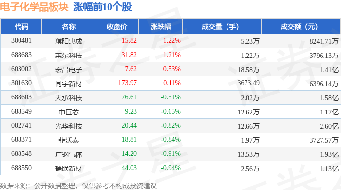 证券之星消息,12月31日电子化学品板块较上一交易日上涨0.16%,唯特偶领涨。当日上证指数报收于 3968.84,上涨0.09%。深证成指报收于13525.02,下跌0.58%。电子化学品板块个股涨跌见下表: | 代码 | 名称 | 收盘价 | 涨跌幅 | 成交量(手) | 成交额(元) | | | --- | --- | --- | --- | --- | --- | --- | | 301319 | 唯特偶 | 55.44 | 8.07% | 7.07万 | | 3.81亿 | | 002584 | 西陇科学 | 9.21 | 4.07% | 52.21万 | | 4.85 Z | | 688548 | 广钢气体 | 14.54 | 3.49% | 15.85万 | | 2.29亿 | | 688545 | 兴福电子 | 37.55 | 2.90% | 9.80万 | | 3.72亿 | | 600330 | 天通股份 | 13.13 | 2.82% | 163.76万 | | 21.60亿 | | 300236 | 上海新阳 | 63.76 | 2.67% | 20.53万 | | 13.15亿 | ...