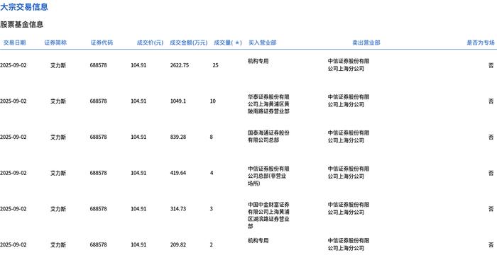 大宗交易概况 - 艾力斯于2025年9月2日发生大宗交易,总成交量52万股,成交总额5455.32万元,占当日总成交额的4.03% [1] - 成交均价为104.91元,较市场收盘价115.29元折价9% [1] 交易细节分析 - 共发生6笔大宗交易,单笔成交量从2万股至25万股不等,单笔成交金额从209.82万元至2622.75万元不等 [2] - 所有交易卖方均为中信证券股份有限公司上海分公司 [2] - 买方包括机构专用席位、中信证券总部(非营业场所)、中金财富证券上海黄浦区营业部等多家机构 [2] - 部分交易标注为专场交易(KA标识) [2]