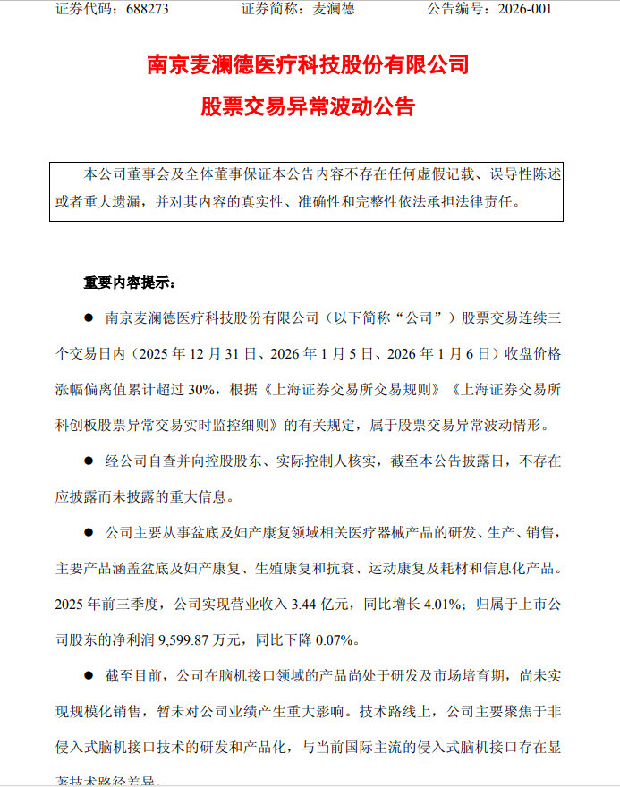 市场表现 - A股脑机接口概念板块于1月7日出现明显回调,多只个股跌幅显著[1] - 麦澜德股价下跌10.68%,总市值54.68亿人民币[1][2] - 熵基科技股价下跌10.13%,总市值101亿人民币[1][2] - 诚益通股价下跌7.55%,总市值69.85亿人民币[1][2] - 雷迪克股价下跌7.14%,总市值83.61亿人民币[1][2] - 博拓生物股价下跌6.37%,总市值67.63亿人民币[1][2] - 爱朋医疗股价下跌6.38%,总市值47.15亿人民币[1][2] - 可孚医疗股价下跌5.55%,总市值100亿人民币[1][2] - 翔宇医疗股价下跌5.31%,总市值132亿人民币[1][2] - 狄耐克股价下跌4.50%,总市值43.11亿人民币[1][2] - 伟思医疗股价下跌4.33%,总市值63.86亿人民币[1][2] 回调原因 - 板块回调与多家概念公司发布业务“降温”公告直接相关[1] - 航天长峰公告称公司未实际开展脑机接口等相关业务[1] - 伟思医疗公告称其在脑机接口领域的新产品仍处于市场培育初期[1] 个股年初至今表现 - 尽管当日回调,部分概念股年初至今累计涨幅仍然可观[2] - 伟思医疗年初至今累计上涨37.77%[2] - 翔宇医疗年初至今累计上涨36.35%[2] - 爱朋医疗年初至今累计上涨34.81%[2] - 诚益通年初至今累计上涨33.09%[2] - 熵基科技年初至今累计上涨29.41%[2] - 麦澜德年初至今累计上涨28.60%[2] - 博拓生物年初至今累计上涨19.88%[2] - 狄耐克年初至今累计上涨14.73%[2] - 雷迪克年初至今累计上涨14.25%[2] - 可孚医疗年初至今累计上涨7.37%[2]