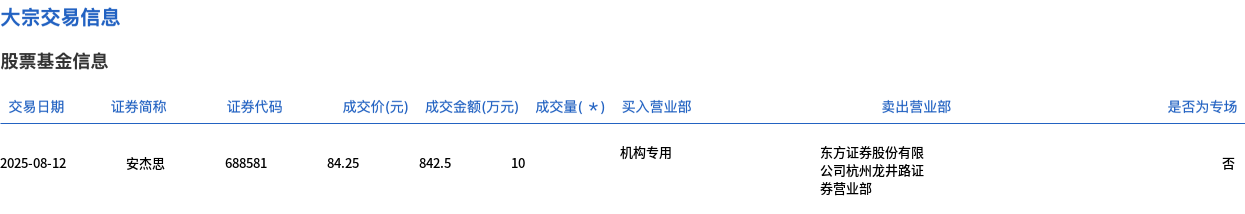 大宗交易概况 - 2025年8月12日安杰思发生大宗交易成交量10万股成交额842.5万元占当日总成交额3.37% [1] - 成交价格84.25元较市场收盘价84.89元折价0.75% [1] 交易细节 - 买方为机构专用席位卖方为东方证券股份有限公司杭州龙井路证券营业部 [2] - 证券代码688581交易通过大宗交易平台完成 [2]