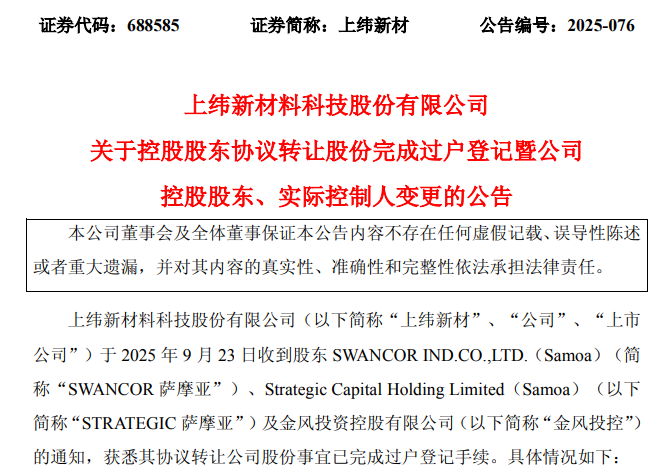 股份转让完成过户登记,上纬新材控股股东变更为智元恒岳
