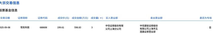 大宗交易概况 - 9月8日大宗交易成交3万股,成交额598.83万元,占当日总成交额0.59% [1] - 成交价199.61元,较市场收盘价251.18元折价20.53% [1] 交易细节 - 买方营业部为中信证券股份有限公司上海分公司 [2] - 卖方营业部为中信建投证券股份有限公司上海市五 [2] - 交易通过非专场形式完成 [2]