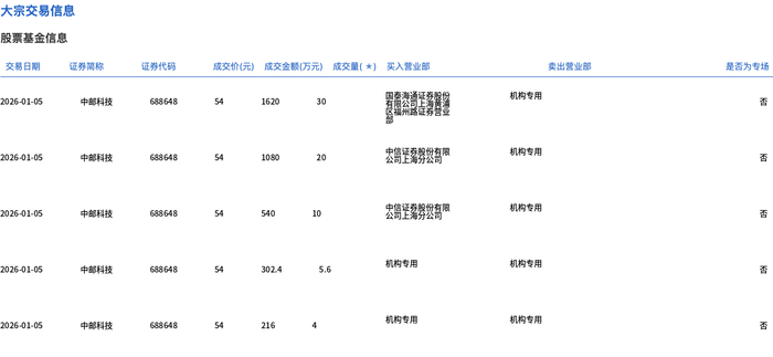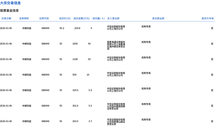 1月6日,中邮科技大宗交易成交79.1万股,成交额4351.3万元,占当日总成交额的7.8%,成交均价55.01 元,较市场收盘价66.96元折价17.85%,其中最高成交价55.2元,最低成交价55元。 | 交易日期 | 证券調称 | 证券代码 | | | 成交价(元) 成交金额(万元) 成交量(*) 买入营业部 | | 类出营业部 | 是否为专场 | | --- | --- | --- | --- | --- | --- | --- | --- | --- | | 2026-01-06 | 中邮科技 | 688648 | 55.2 | 220.8 | 4 | 去筒语参考发稿限 | 机构专用 | 종 | | 2026-01-06 | 中邮科技 | 688648 | દર | 1650 | 30 | | 机构专用 | Ka | | 2026-01-06 | 中邮科技 | 688648 | રેર | 1100 | 20 | 中信证券股份有限 公司上海分公司 | 机构专用 | 잡 | | 2026-01-06 | 中邮科技 | 688648 | રેર | 550 | 10 | 去日本公式 | 机构专用 | K ...