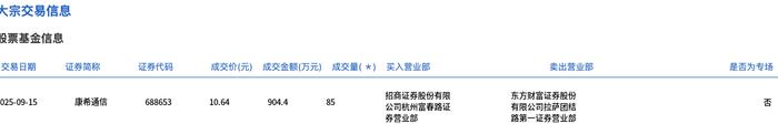 大宗交易概况 - 康希通信于9月15日发生大宗交易成交85万股[1] - 成交金额达904.4万元[1] - 占当日总成交额比例6.09%[1] 价格分析 - 成交价10.64元较市场收盘价13.35元折价20.3%[1] - 交易通过招商证券杭州富春路营业部买入[2] - 东方财富证券拉萨团结路营业部作为卖出方[2] 交易结构 - 该笔交易被标记为专场交易[2] - 证券代码为688653[2] - 交易日期为2025年9月15日[2]