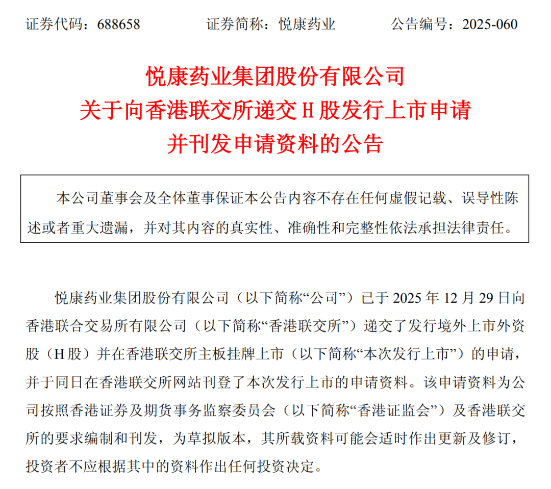 (图源:悦康药业公司公告) 港股生物医药板块迎来久违的上涨行情。 百济神州、翰森制药等龙头股价节节攀升。就在这一黄金窗口期,A股科创板药企悦康药业(688658.SH)悄然按下赴港上市 "加速键。 2025 年末,悦康药业向港交所递交招股书,拟以 "双重主要上市" 模式登陆主板,中信证券担任独家保荐人。这家总市值约 120 亿元的企业,正深陷转型 阵痛:2022-2024 年营收、净利润三连降,2025 年前 7 个月更是由盈转亏;核心产品悦康通量价齐跌,心脑血管业务收入占比从 61% 腰斩至 39%。 矛盾的是,业绩承压、现金流趋紧之际,公司 2022-2024 年仍累计分红超 8.9亿元,控股股东于伟仕家族凭借 49.26% 的表决权分得近半。 这场 "A+H" 冲刺背后的取舍与野心,引发市场广泛关注。如今冲刺港股,悦康药业试图通过募资补血,押注寡核苷酸、mRNA 疫苗等创新管线。 但这场 "补血" 之旅,究竟是转型破局的关键一步,还是业绩压力下的无奈之举? 从仿制药龙头到创新转型 悦康药业的发展轨迹,堪称中国医药行业转型的缩影。 据天眼查显示:悦康药业集团股份有限公司 (曾用名:悦康药业集团有限公司) ...