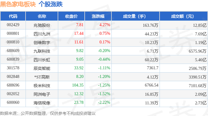 从资金流向上来看,当日黑色家电板块主力资金净流出1.6亿元,游资资金净流出729.27万元,散户资金 净流入1.67亿元。黑色家电板块个股资金流向见下表: 证券之星消息,12月26日黑色家电板块较上一交易日上涨0.28%,兆驰股份领涨。当日上证指数报收于 3963.68,上涨0.1%。深证成指报收于13603.89,上涨0.54%。黑色家电板块个股涨跌见下表: | 代码 | 名称 | 收盘价 | 涨跌幅 | 成交量(手) | 成交额(元) | | | --- | --- | --- | --- | --- | --- | --- | | 002429 | 兆驰股份 | 7.81 | 4.27% | 163.76万 | | 12.85 Z | | 000801 | 四川九洲 | 17.44 | 0.75% | 44.23万 | | 7.69亿 | | 000810 | 创维数字 | 11.61 | 0.17% | 10.23万 | | 261T | | 688609 | 九联科技 | 9.82 | -0.20% | 6.71万 | 6575.96万 | | | 600839 | 四川长虹 | 9.05 | -0 ...