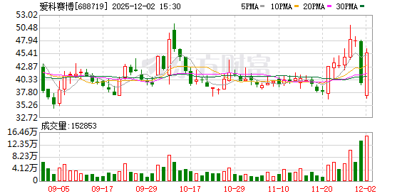 股价与交易表现 - 12月8日,爱科赛博收盘价为49.37元,收盘涨停,全天振幅达17.63% [2] - 当日成交额为5.41亿元,换手率为13.18% [2] - 因日收盘价涨幅达15%登上科创板龙虎榜 [2] 龙虎榜资金数据 - 上榜的前五大买卖营业部合计成交1.89亿元,其中买入成交1.16亿元,卖出成交7379.30万元,合计净买入4187.34万元 [2] - 全天主力资金净流入6307.94万元 [3] - 机构专用席位现身卖二,卖出1618.89万元,该席位净卖出1618.89万元 [2] 买卖席位明细 - 第一大买入营业部为高盛(中国)证券上海浦东新区世纪大道营业部,买入2598.02万元 [2] - 第二大买入营业部为摩根大通证券(中国)上海银城中路营业部,买入2355.21万元 [2] - 卖出方面,高盛(中国)证券同一营业部亦为卖一,卖出1732.86万元 [3] - 摩根大通证券(中国)上海银城中路营业部同时位列卖四,卖出1443.37万元 [3]